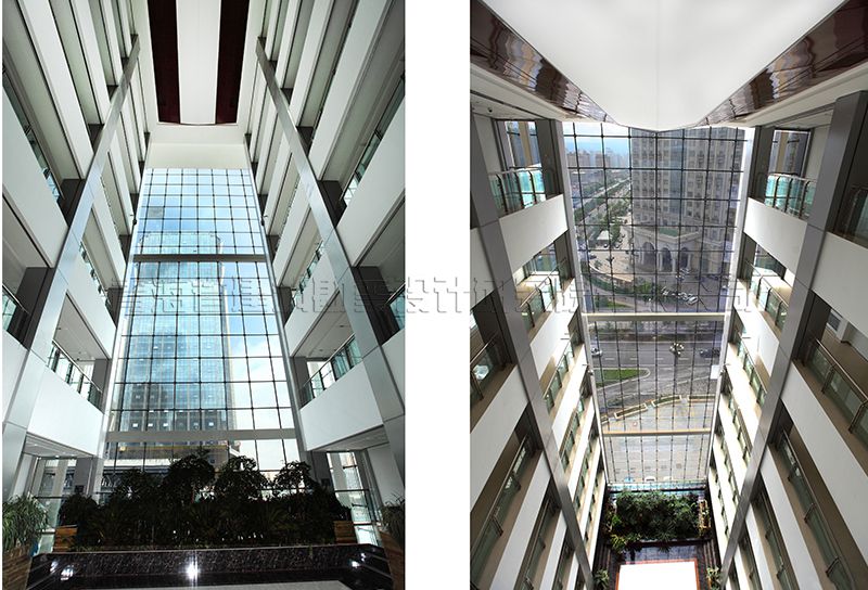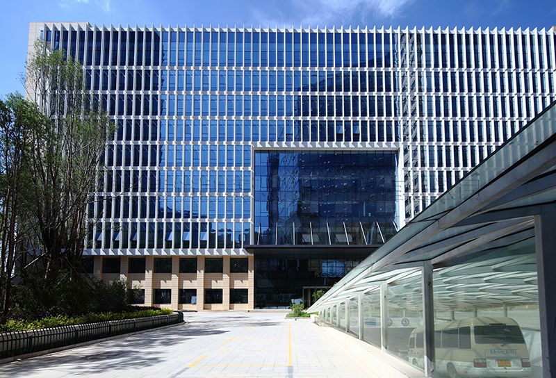 建筑體型:A區(qū)、B區(qū)一至四層為一個(gè)整體,內(nèi)部根據(jù)不同功能劃分平面。A區(qū)主樓平面呈矩形,B區(qū)主樓平面呈橄欖形,建筑立面窗采用玻璃幕墻及矩形窗的分隔方式,實(shí)體墻分為掛貼米色陶土板,立面豎向線條為鋁合金象牙白氟碳涂膜,立面設(shè)計(jì)手法現(xiàn)代、簡(jiǎn)潔、方正、大氣,達(dá)到良好的視覺效果,幕墻與實(shí)體墻比例劃分恰當(dāng),米色陶土板墻面分格細(xì)膩,具有高品質(zhì)現(xiàn)代辦公建筑的特征,成為西寧海湖新核心區(qū)有特點(diǎn)的標(biāo)志建筑。