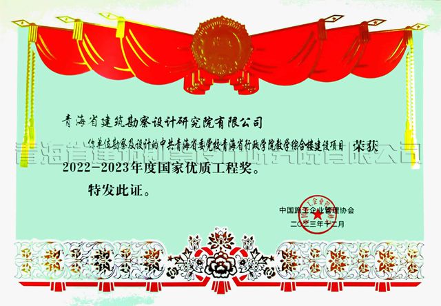 近日,中國(guó)建筑業(yè)協(xié)會(huì)、中國(guó)施工企業(yè)管理協(xié)會(huì)評(píng)選的2022-2023年度國(guó)家級(jí)優(yōu)質(zhì)工程獲獎(jiǎng)名單揭曉,由我院巖土公司勘察的“中共青海省委黨校青海省行政學(xué)院教學(xué)綜合樓建設(shè)項(xiàng)目”獲“國(guó)家優(yōu)質(zhì)工程獎(jiǎng)”。