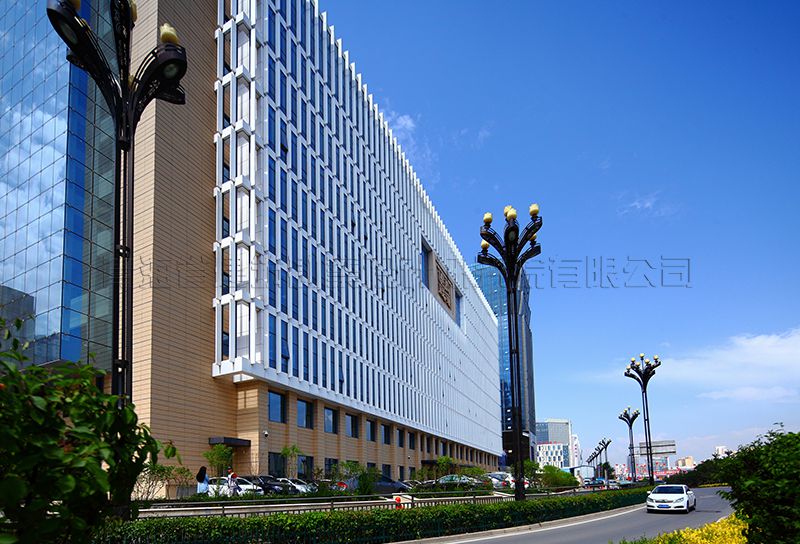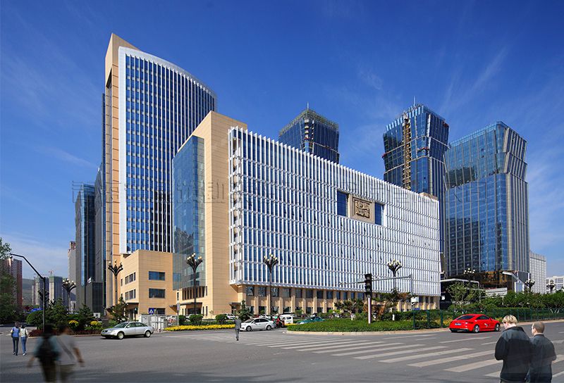 建筑體型:A區(qū)、B區(qū)一至四層為一個(gè)整體,內(nèi)部根據(jù)不同功能劃分平面。A區(qū)主樓平面呈矩形,B區(qū)主樓平面呈橄欖形,建筑立面窗采用玻璃幕墻及矩形窗的分隔方式,實(shí)體墻分為掛貼米色陶土板,立面豎向線條為鋁合金象牙白氟碳涂膜,立面設(shè)計(jì)手法現(xiàn)代、簡(jiǎn)潔、方正、大氣,達(dá)到良好的視覺效果,幕墻與實(shí)體墻比例劃分恰當(dāng),米色陶土板墻面分格細(xì)膩,具有高品質(zhì)現(xiàn)代辦公建筑的特征,成為西寧海湖新核心區(qū)有特點(diǎn)的標(biāo)志建筑。